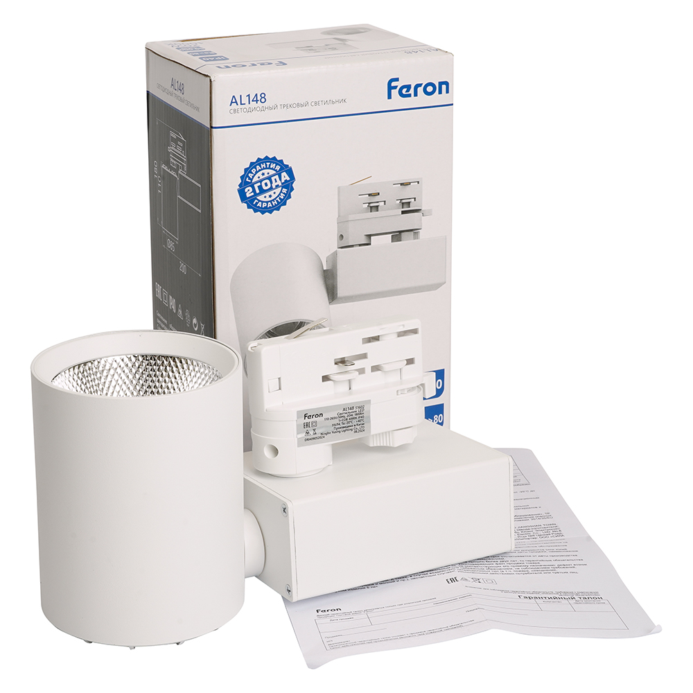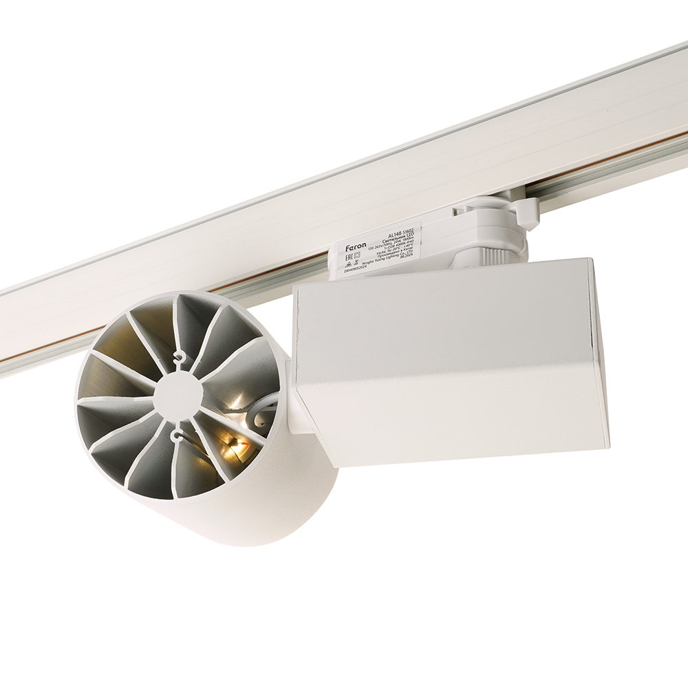 Светильник трековый на шинопровод, трехфазный (ДПО) FERON AL148, 20W, 4000К (белый), 170-265V, 1800Lm, цвет белый, корпус алюминий, рассеиватель поликарбонат, вращение →350°/↓90°, 200*85*180 мм