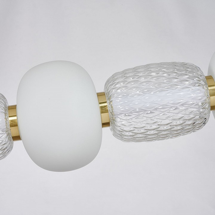 Металлический каркас цвета золота, плафоны в виде бусин разнообразных форм из выдувного стекла двух видов - прозрачного и цвета опала, часть каркаса фиксируется тросиком для баланса. Чередование стеклянных плафонов разной формы, цвета и рисунка, а также цветовое решение каркаса в золоте создает насыщенный сложный и дорогой образ. Плафоны из стекла выдуваются вручную