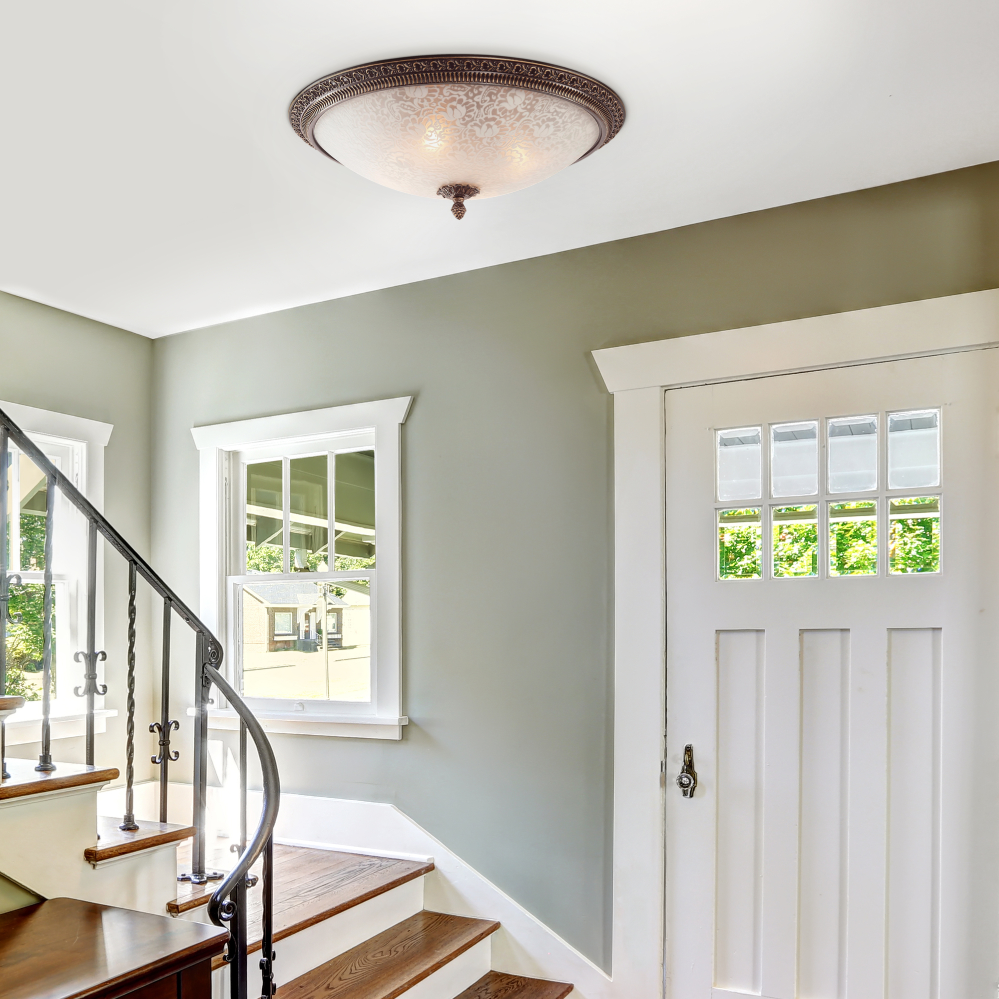 Металлическая арматура, оттенки – античная бронза, белый с золотом. Плафон – матовое стекло, пескоструйный рисунок. Обод и наконечник с прессованным орнаментом.